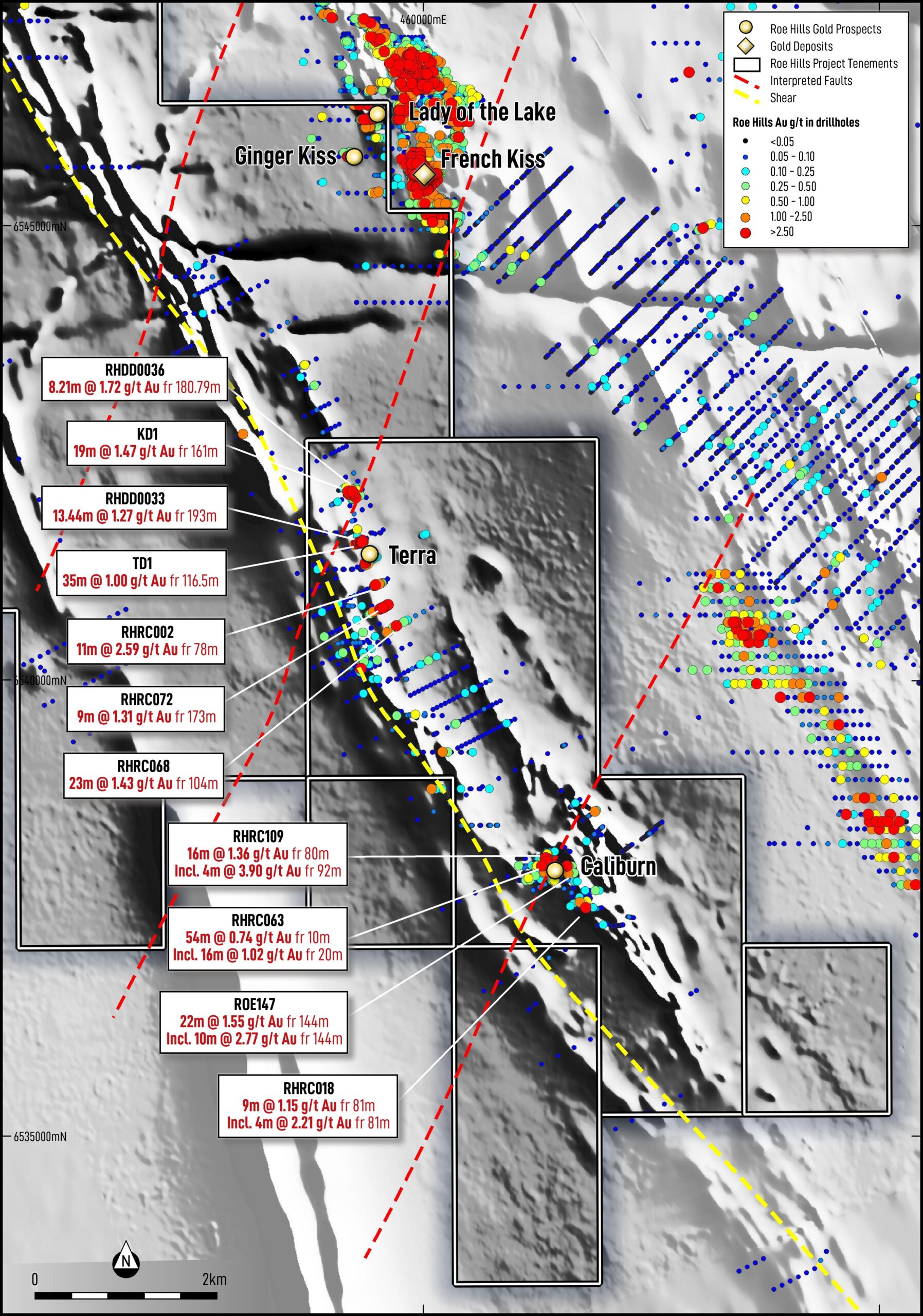 Historic drilling results for gold across the project and has defined a hard rock mineralised zone >5km in strike length at the Terra and Caliburn Prospects. The zone is open in all directions.